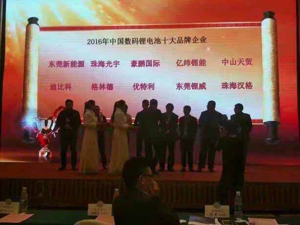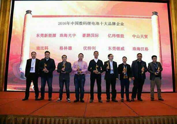 附圖1:榮獲“2016年中國3C鋰電池十大品牌”獎杯