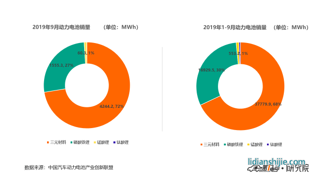 2019年1-9月,我國(guó)動(dòng)力電池累計(jì)銷量達(dá)55.6GWh,其中三元電池累計(jì)銷售37.8GWh,占總銷量68%;磷酸鐵鋰電池累計(jì)銷售16.9GWh,占總銷量比30.5%。磷酸鐵鋰電池市場(chǎng)較去年同期仍存在一定差距。