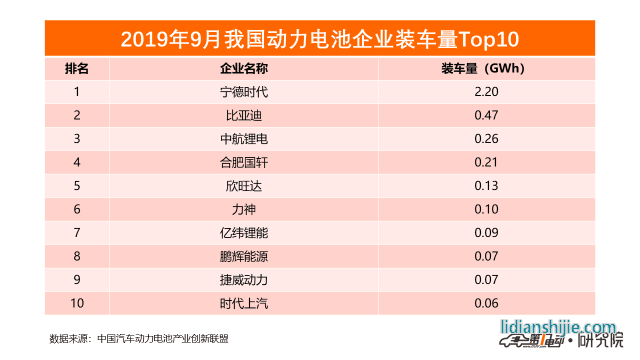 企業(yè)方面,2019年9月,我國(guó)新能源汽車市場(chǎng)共計(jì)52家動(dòng)力電池企業(yè)實(shí)現(xiàn)裝車配套,較8月份增加8家。排名前3家、前5家、前10家動(dòng)力電池企業(yè)動(dòng)力電池裝車量分別為2.9GWh、3.3GWh和3.6GWh,占總裝車量比分別為74.0%、82.5%和92.0%。