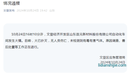 據文登區應急管理局通報,10月24日16時10分許,文登經濟開發區山東亙元新材料股份有限公司自動化車間發生火情。目前,火已撲滅,無人員傷亡,未檢測到有毒有害氣體。原因調查、善后處置等工作正在進行。