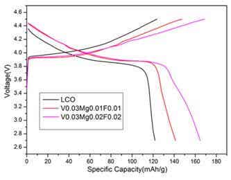 圖4 為LiCo0.95Mg0.02V0.03O1.98F0.02的倍率充放電曲線