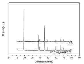 原料:碳酸鋰(Li2CO3,分析純, AR),四氧化三鈷(Co3O4,分析純,AR),五氧化二釩(V2O5,分析純,AR),六水合硝酸鎂(Mg(NO3)2.6H2O,分析純,AR),氟化鋰(LiF,分析純,AR)。