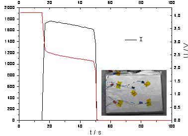 圖9為電池短路過程中電池電壓、電流的變化曲線測試結果圖。從圖中可以看出,電池在經過短