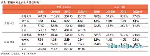 天能動(dòng)力2020H1鉛酸電池營(yíng)收106.3億元,占當(dāng)期總營(yíng)收比例47%,鋰電池營(yíng)收4.03億元,占比僅1.8%;