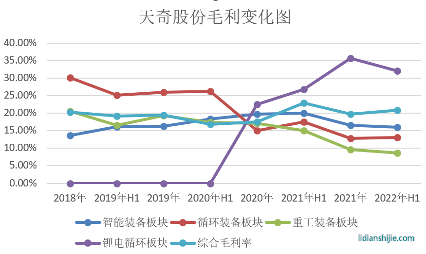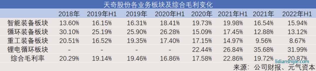 不過,在其鋰電循環(huán)板塊高毛利的帶動之下,天奇股份綜合毛利率在隨后的兩年里重新上升至2022年H1的20.87%。在此期間,其鋰電循環(huán)業(yè)務(wù)產(chǎn)能充分釋放的帶動下毛利率從2020年的22.44%快速上升至30%以上,也扭轉(zhuǎn)了包括智能裝備板塊在內(nèi)的其余三塊業(yè)務(wù)毛利持續(xù)下降帶給其綜合毛利的負(fù)面影響。