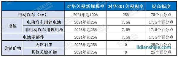 非電動(dòng)汽車用鋰電池、天然石墨的關(guān)稅稅率將于2026年開始,提高至25%。
