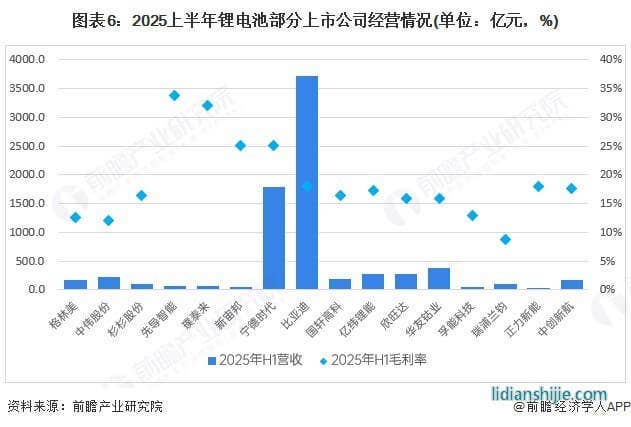 2025上半年鋰電池代表性企業(yè)收入中,最高的是比亞迪,超過3500億元,寧德時(shí)代為1788億元,毛利率為25%,是所有企業(yè)中最高。億緯鋰能為281.7億元,毛利率為17.3%,盡管和寧德時(shí)代差距較大,但是在上市公司中收入規(guī)模龐大。欣旺達(dá)收入為26.9億元,毛利率為15.8%,國軒高科收入為19.39億元,毛利率為16.4%。孚能科技收入較低,為43.5億元,毛利率13%。