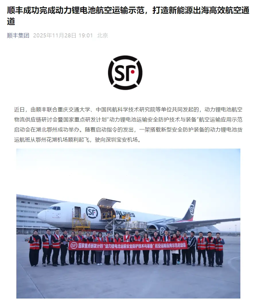 我國首次:順豐成功完成動力鋰電池航空運輸示范