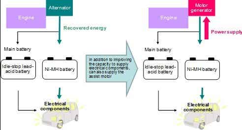 松下電器近期開發(fā)出一款鎳氫能量回收系統(tǒng),這款系統(tǒng)專為配備啟停系統(tǒng)的汽車設(shè)計(jì),其額定電壓為12V。車輛在制動過程中,產(chǎn)生的熱量將被轉(zhuǎn)化儲存在電池中,這些被儲存的能量將來則為汽車電氣系統(tǒng)提供電力,從而確保在發(fā)動機(jī)沒有運(yùn)行時,電氣系統(tǒng)的正常供能。該系統(tǒng)同樣可以用來給輔助馬達(dá)提供電力驅(qū)動,以提高汽車燃油經(jīng)濟(jì)性。