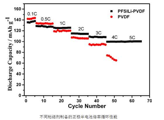 近年來,中國科學院寧波材料技術與工程研究所研究員薛立新領導的高分子功能膜團隊在鋰離子電池粘結劑方面取得一系列的進展,合成了具有含氟磺酰亞胺主鏈以及具有全氟磺酸側鏈的離子聚合物,以其作為鋰電池粘結劑的極片具有良好的電化學穩定性,與使用PVDF粘結劑的極片相比,體現出更小的峰電位差,表明含有導電粘結劑的極片內部脫鋰/嵌鋰氧化還原反應可逆性更好,極化更小。