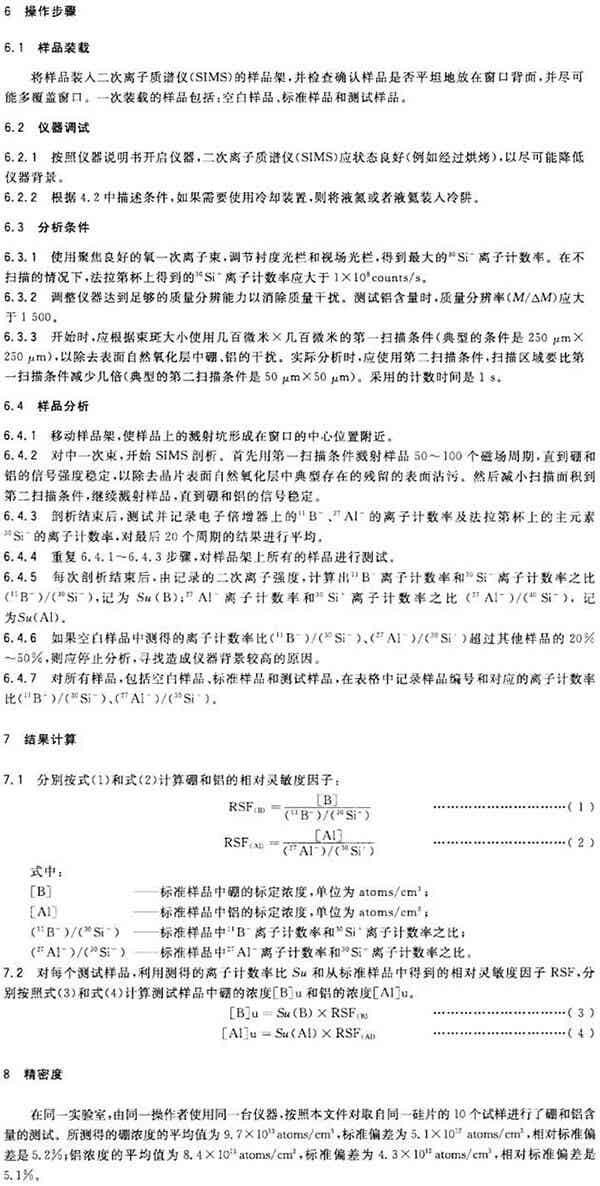 需要一個共摻雜或分別摻雜硼和鋁的硅單晶標準樣品,且硼和鋁的體濃度經過各方都認同的其他測量方法測定,濃度在(1-10)×1015atoms/cm3范圍內,分布均勻性在5%以內。標準樣品的分析面應進行化學腐蝕拋光或者效果更好的化學機械拋光,使其平坦光滑。