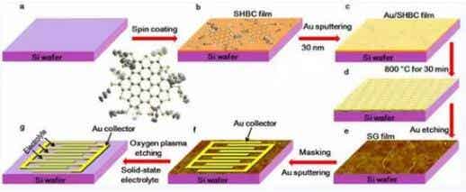 該研究團(tuán)隊(duì)利用納米金薄層的二維納米限域效應(yīng)和金催化作用,采用自下而上逐步熱解法成功制備出連續(xù)、均勻的硫摻雜石墨烯薄膜;以該薄膜為電極,采用微納加工技術(shù)構(gòu)建微型超級電容器。該電容器具有體積比容量高(582F/cm3),循環(huán)穩(wěn)定性好和功率密度高(1191W/cm3)等優(yōu)點(diǎn)。機(jī)理研究表明,納米金薄層的存在有利于形成穩(wěn)定的S-Au鍵、C-S鍵,從而實(shí)現(xiàn)了納米石墨烯主體結(jié)構(gòu)完整、硫元素均勻摻雜和薄膜厚度均一。該工作為自下而上法可控制備大面積、連續(xù)石墨烯薄膜提供了新思路;也為硫摻雜石墨烯提供了新方法,并證實(shí)了硫摻雜能顯著提高石墨烯薄膜的電化學(xué)性能。