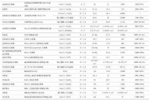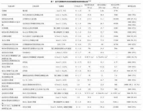 通常來講,非對(duì)稱超級(jí)電容有更高的工作電壓和能量功率密度。從材料的角度來看,基于石墨烯的非對(duì)稱超級(jí)電容的正極材料包括氧化錳、氧化鈷、氧化釕、聚苯胺、聚吡咯,純石墨烯、以及石墨烯與上述材料的復(fù)合物;負(fù)極材料包括石墨烯,多孔石墨烯,石墨纖維,石墨烯薄膜、石墨/碳納米管和石墨烯金屬氧化物復(fù)合物氧化物等。表1總結(jié)了目前基于石墨烯材料的非對(duì)稱超級(jí)電容的研究進(jìn)展,比較了不同石墨烯基非對(duì)稱超級(jí)電容的性能。