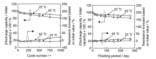45℃(△)循環時的充放電循環壽命性能。 及4.025V浮充條件下的日歷性能。該電池在