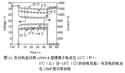 LVP65-8電池組發動機起動放電時的電壓變化示于圖11。試驗條件是在25℃的環境溫度中使LVP65-8電池組以70A的恒電流充電到32.2V,接著繼續以相同的電壓合計充電3小時后,在環境溫度25、0及-18℃的條件下進行15kw的恒電流放電。由圖得知,放電時的峰值電流溫度越低越大,在-18度時超過650A。但是,在這種低溫大電流放電的條件下,本電池組也能維持20V以上的電壓,具有良好的起動性能。